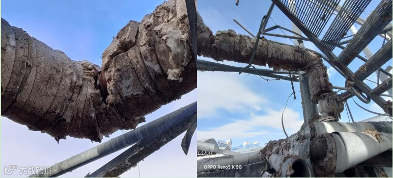 图15 一效脱酚塔上塔与二效下塔连接管勘查情况