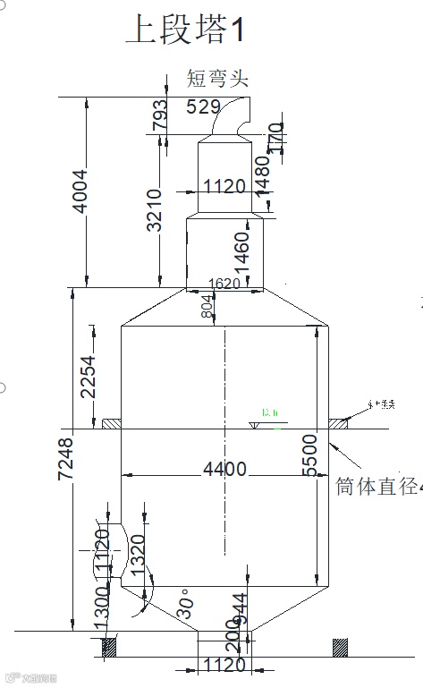 事故设备是脱酚装置一效脱酚塔上塔。该设备筒体为立式圆筒形结构,上下封头为无折边锥形封头,由四只耳式支座支撑,直径4400mm,板厚12mm,高10658mm,材料Q235B(见图2)。