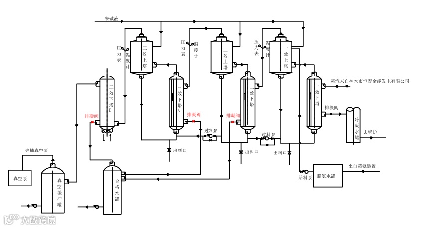 在真空泵的作用下,一效脱酚塔上塔产生的蒸汽进入二效脱酚塔下塔壳程加热二效脱酚塔内的介质,二效脱酚塔上塔产生的蒸汽进入三效脱酚塔下塔A壳程加热管程内的介质,二效脱酚塔下塔和三效脱酚塔下塔A、三效脱酚塔下塔B产生的冷凝水进入合格水罐。