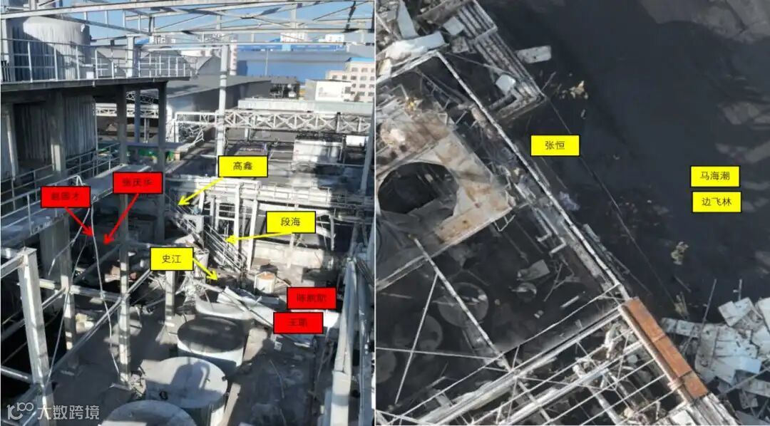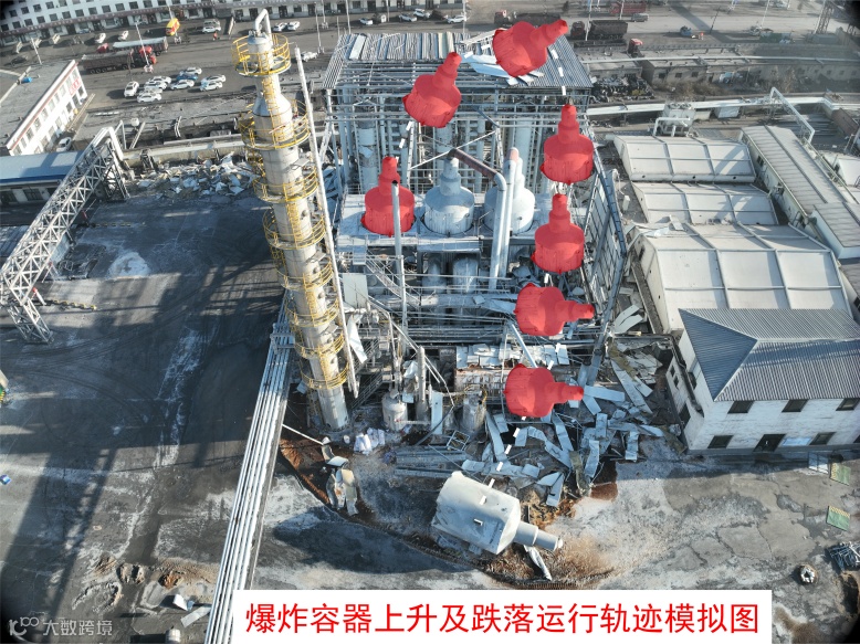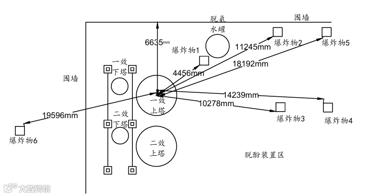 事故设备(脱酚装置一效脱酚塔上塔)爆裂为六部分,其中五部分在脱酚装置区,另一部分在装置外(见图9)。