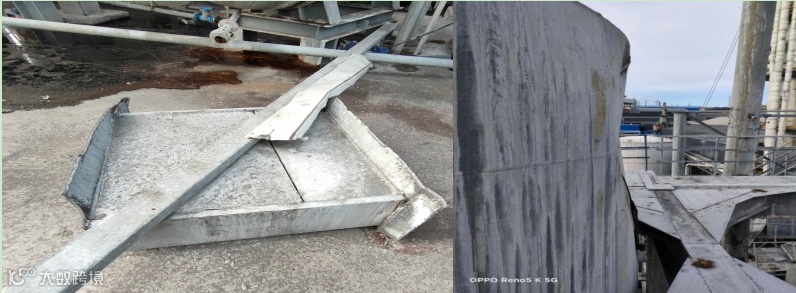 (2)二效脱酚塔上塔与一效脱酚塔上塔支座连接件脱落,脱落支座处上部筒体部分凹陷,范围为高2300mm×宽1700mm,最深为160mm(见图14)。