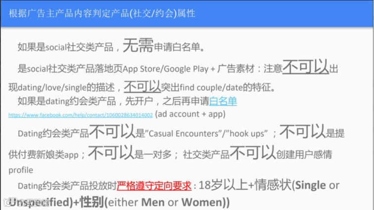 很多应用在买量的时候就会遇到问题,有些应用想要投放广告需要开通白名单,如社交类App如果带有约会属性的话就要开白名单,如果没有开通白名单,就不允许投广告,必须讲产品内带有约会元素的功能都去除,否则一旦上线发生违规,App就会被Facebook拉黑。想要知道怎样看自己App是社交还是约会,可以参考下图。