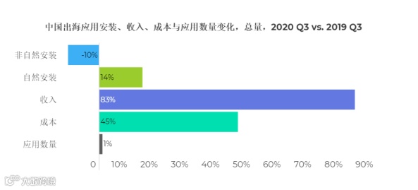 从最早的“工具出海”,到电商、游戏、小说漫画、以及泛娱乐类应用。出海应用品类越来越丰富。截止到 2020 年第三季度,中国出海应用在数量上与去年保持相当,增长 1%,总体营收年度增长83%,买量成本在过去一年攀升了 45%,非自然安装量同比下滑 10%。