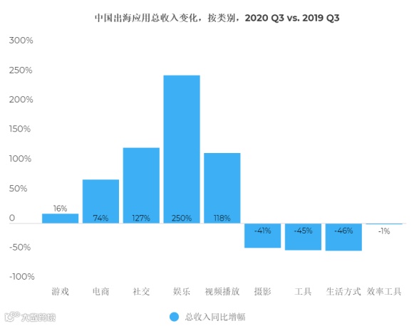 与2019年相比,中国出海应用出海变化巨大,其中娱乐、社交、视频类收入剧增,而工具、摄影类的应用收入则减少很多。