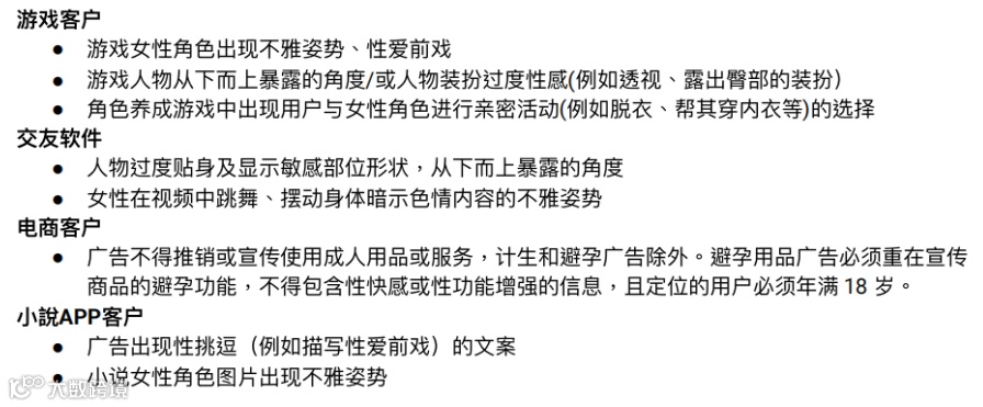 广告不得包含成人内容,包括展示裸体、暗示或赤裸地描述性爱姿势,以及属于过分性暗示或性挑逗的活动。
