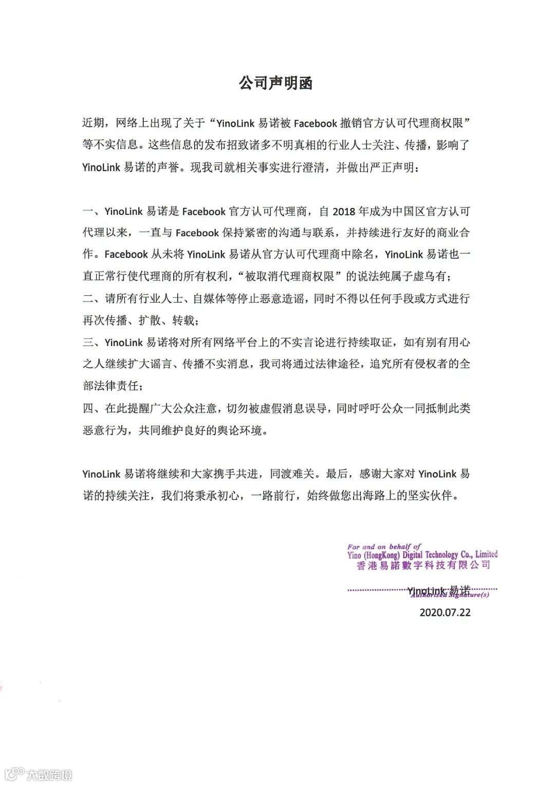 近期,网络上出现了关于“YinoLink易诺被Facebook撤销官方认可代理商权限”等不实信息。这些信息的发布招致诸多不明真相的行业人士关注、传播,影响了YinoLink易诺的声誉。现我司就相关事实进行澄清,并做出严正声明: