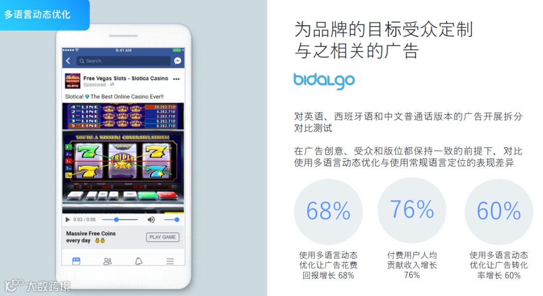 57%的全球网购者表明,购物网站的语言会影响购物体验,如果网站上面的语言是母语的话,下单可能会更快。有案例表明,在广告创意、受众和版位都保持一致的前提下,使用多语言动态优化让广告花费回放增长68%,付费用户人均花费增长76%,广告转化率增长60%。