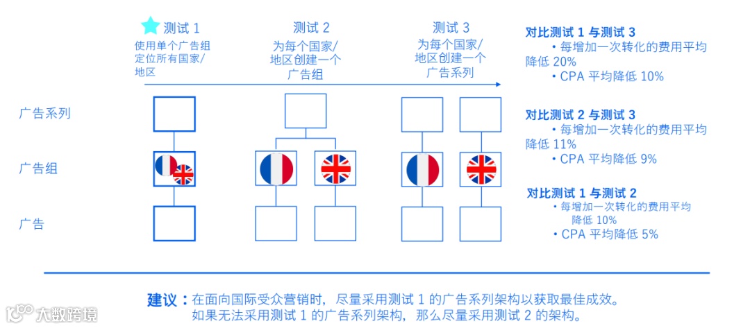 综合数据来看,Facebook代理YinoLink易诺建议各位广告主在面向国际受众营销时,尽量采用测试 1 的广告系列架构以获取最佳成效。如果无法采用测试 1 的广告系列架构,那么尽量采用测试 2 的架构。
