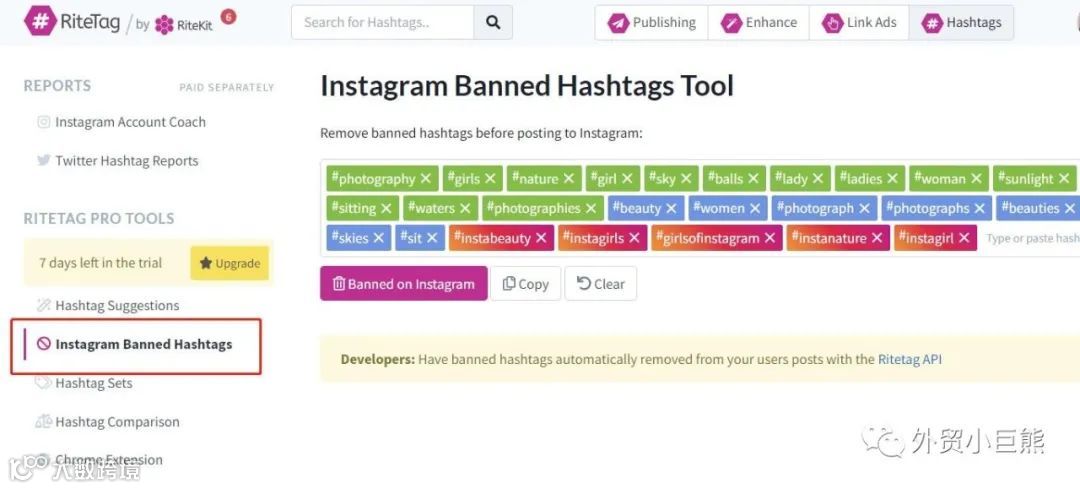 RiteTag 可以根据社交媒体上的图片或文字自动生成建议标签,并检测使用的关键词是否为 Instagram 禁用词,从而帮助避免因禁用词导致的内容曝光不足。