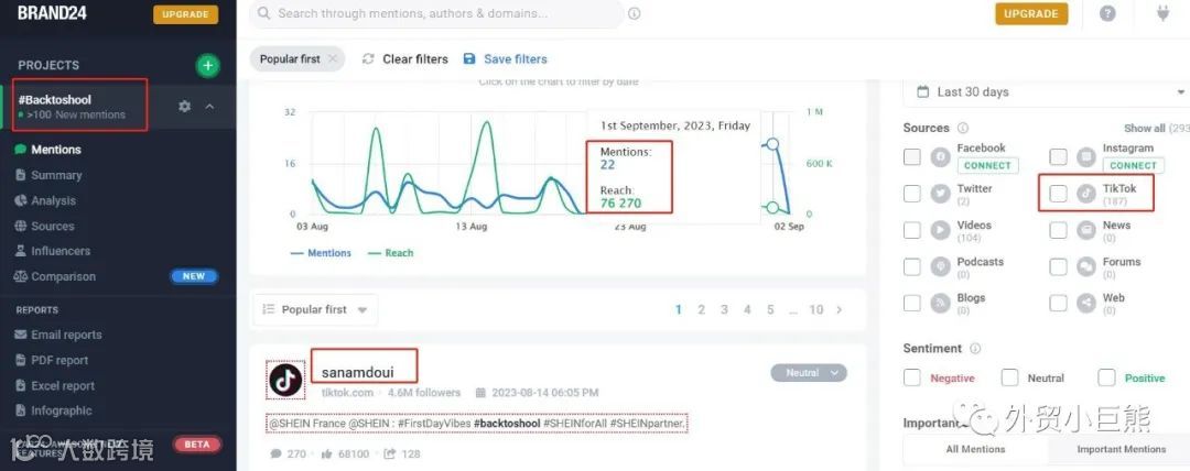 这款工具可以追踪品牌在新闻媒体、博客、视频、论坛等平台上的提及次数以及预估触达人数,同时支持跟踪 Twitter、Instagram、TikTok 等网站上的 hashtag。输入关键词 #backtoshool 后,可看到具体某一天被提及的次数和社交平台分布。