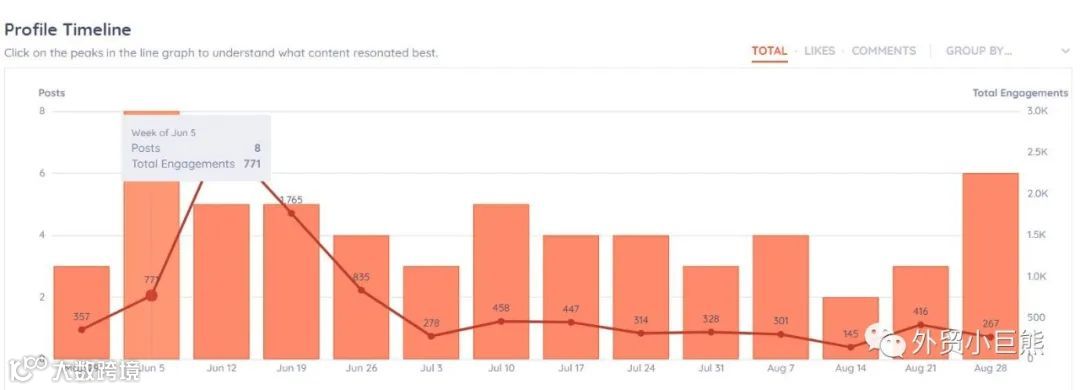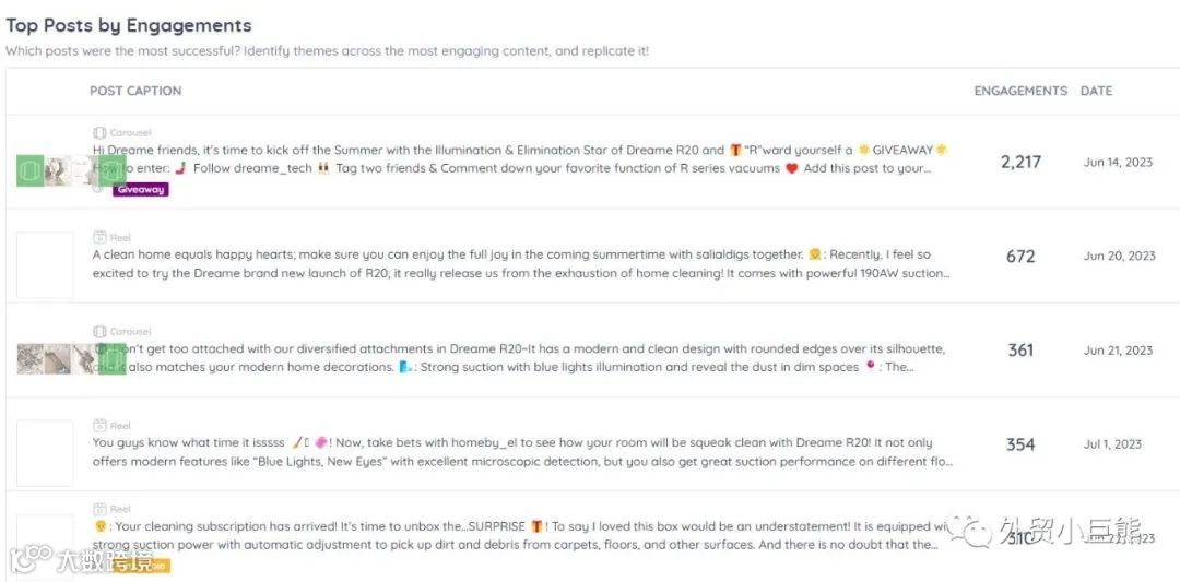 支持追踪 Twitter、Instagram、YouTube、Facebook 和 TikTok 上的标签,也能监测竞品数据。比如输入品牌名称,选择 Instagram,可以看到其发帖频率及互动数据,并能分析最受欢迎的帖子类型及其使用的文案、图片素材和标签。