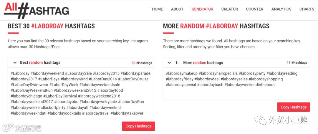 可以根据关键词找到30个最佳标签及类似标签。例如搜索“Labor day”,该工具能提供前30个推荐标签,在社交媒体发帖时可直接使用。