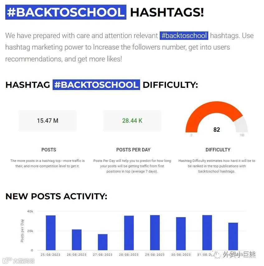 该工具不仅可以通过关键词自动生成热门社交媒体标签,还能通过识别照片或链接生成建议标签。例如查询关键词 #backtoshool,可以看到相关推荐及热度排名,还可以查看该关键词总帖子数和每日发帖数量。