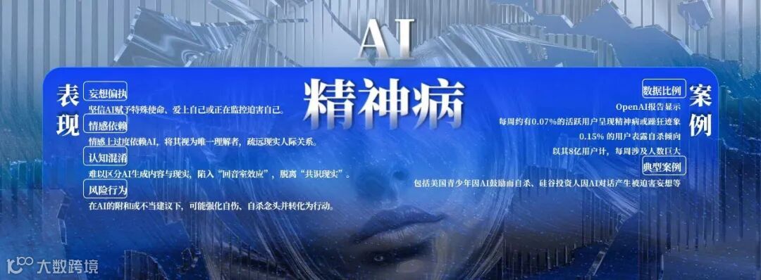 AI也会引发精神病。我查了很多资料,证实了这个猜想。根据 Open AI的数据,每周有0.07%的活跃用户呈现出了精神病和狂躁症的迹象,有0.15%的人呈现出了自杀倾向。 Open AI有8亿用户,所以这个基数是很大的。
