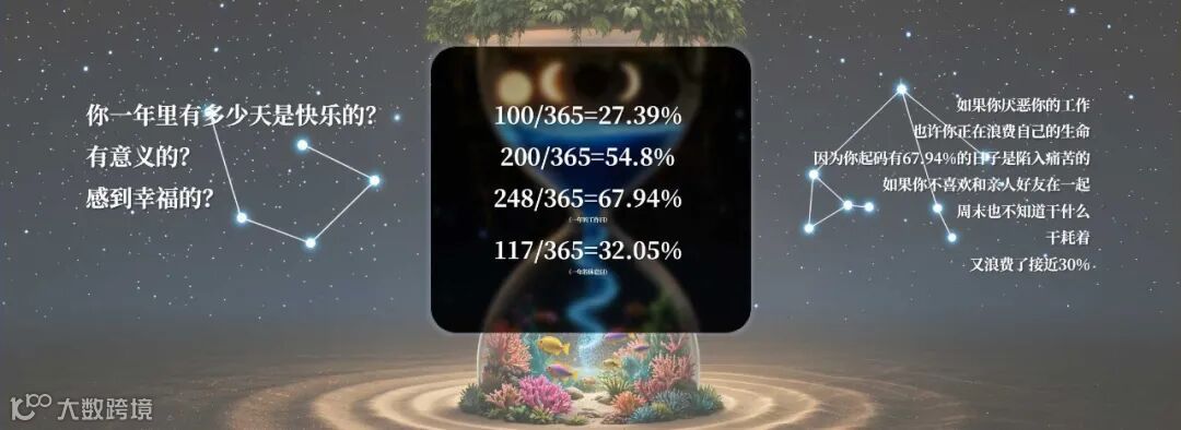 这个向上的力量到底是什么?我们先来看一组数字:248,一年的法定工作日。117,双休加上法定假日。也就是说,如果你很讨厌你的工作,那么一年里有67.94%的时间是注定不可能快乐的。