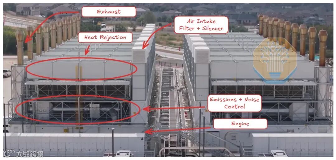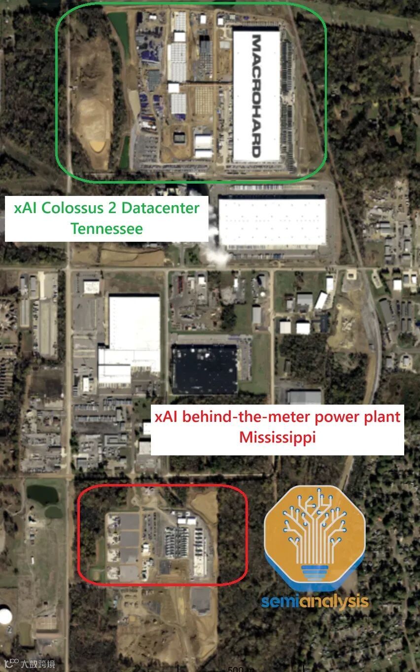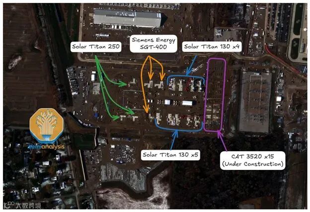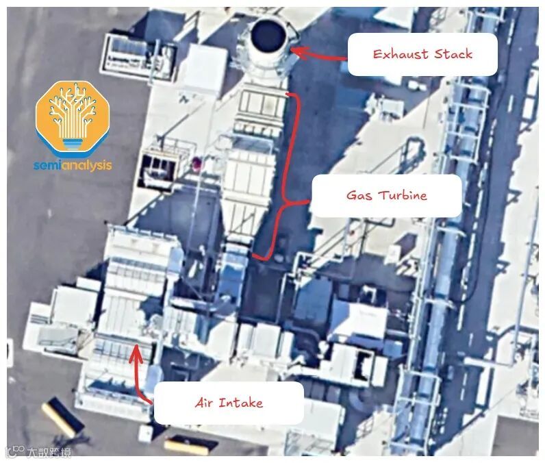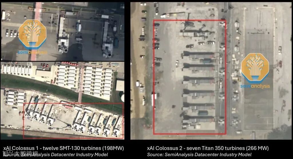 xAI完全绕开了电网,在现场发电,使用的是卡车搭载的燃气轮机和发动机。如下图所示,xAI已经在其数据中心附近部署了超过500MW的燃气轮机。在一个AI实验室竞相率先建成“吉瓦级数据中心”的世界里,速度就是护城河。