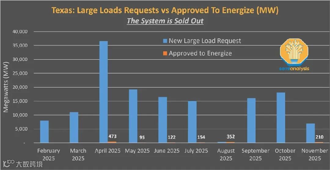 下图讲述了整个故事:仅在德克萨斯州,每个月就有数十吉瓦的数据中心负载申请涌入。然而,在过去12 个月中,获批的容量barely超过1GW。电网已经被“卖空”了。