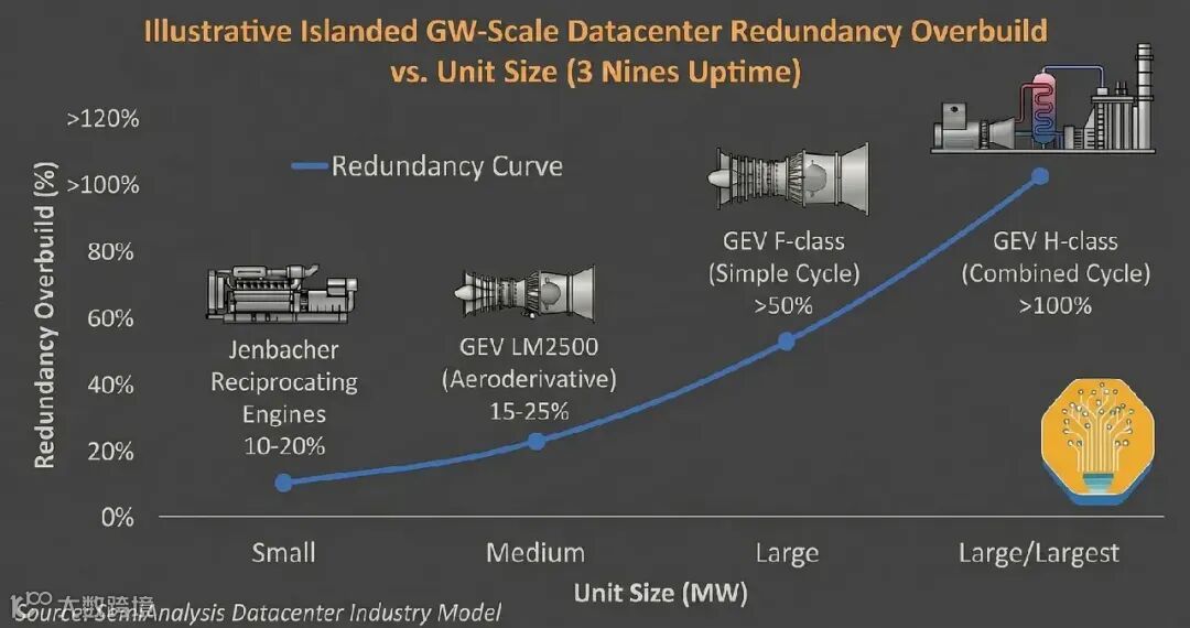冗余也为运营方带来了新的难题:系统规模与超配比例之间存在权衡。尽管H 级和 F 级重型轮机在能效上优于航改机,但更高的冗余需求意味着,如果设计不当,基于重型轮机的孤岛系统,其电力成本可能反而高于航改方案。因此,除了单纯“超配”,还需考虑其他方案,例如:使用小型轮机作为备用,甚至保留一个电网接入点。