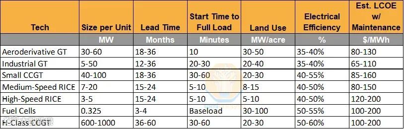在ChatGPT出现之前,只有电力公用事业公司和独立发电商(IPP)才有理由购买单机容量超过 250 MW 的燃气轮机,因为超过这一规模的设备对于大多数工业应用来说都过于庞大。正如前文所述,部署速度是一个问题;然而,我们正越来越多地看到开发商采用“小型航空衍生型轮机 / RICE 作为过渡电源(bridge power)”,在大型 CCGT 投运后再将其转为备用或冗余电源。