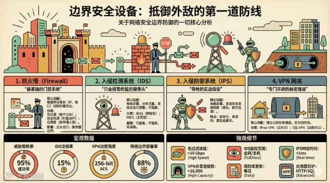 这一层设备主要部署在网络出口或区域边界,相当于企业网络的 “小区门禁 + 外围保安”,守住外部攻击的第一道关口。