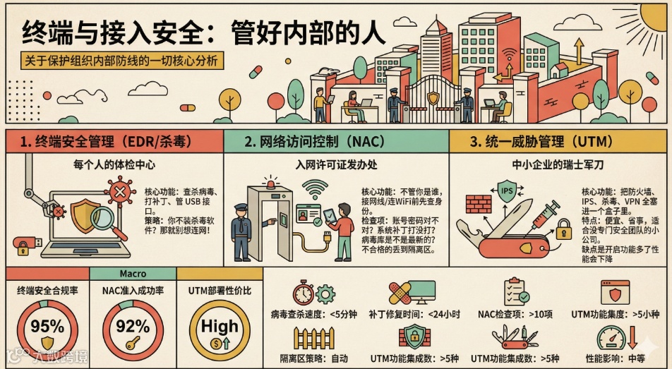 堡垒往往从内部攻破,这一层设备聚焦内网接入与终端管理,管住 “自己人”,防范内部风险。