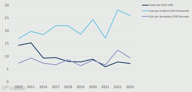 尽管扣除免赔额后IG P&I承担的总成本较2000年代和2010年代初高峰有所回落,但单次事件和单名偷渡者的处置成本持续上升。当前每起事件成本接近3万美元,每名偷渡者约1万美元。实际船东成本更高,因还包括免赔额及其他未投保支出。