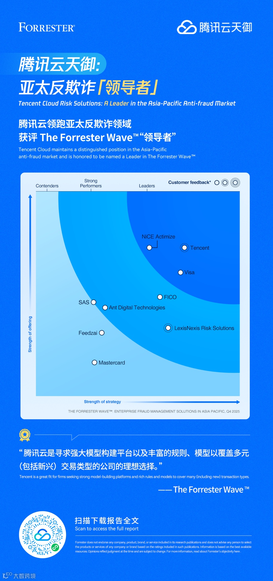 在最新发布的《The Forrester Wave™: Enterprise Fraud Management Solutions In Asia Pacific, Q4 2025》报告中,腾讯云被评为亚太地区企业欺诈管理市场「领导者」。并且,在服务能力和战略维度,腾讯云均位居参评厂商榜首;今年新增的客户反馈评级,同样获得了「Above Average」(技术实力与客户口碑双双在线)的评价。