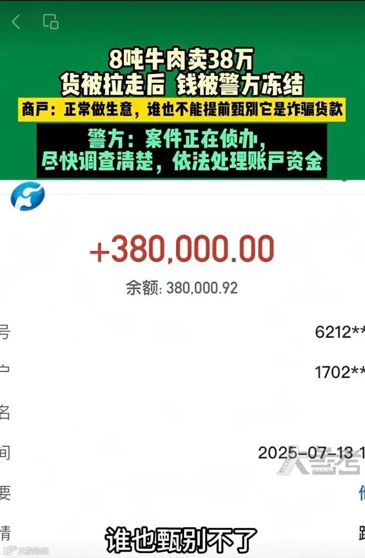 据河南广播电视台报道,有商贩称收到38万货款后8吨牛肉被拉走,结果几小时后货款因“涉诈”而被冻结。