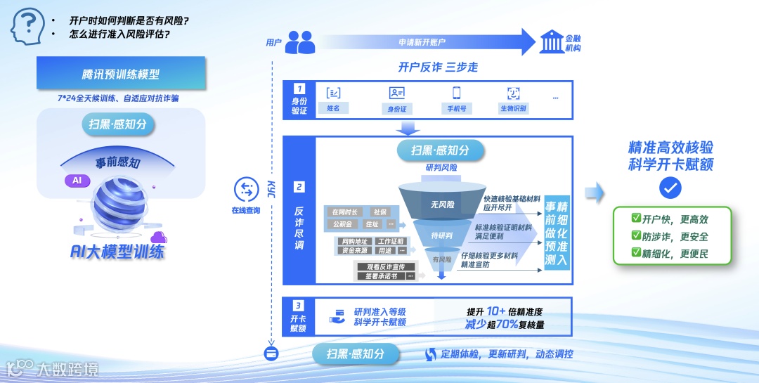 “扫黑”模型的嵌入,为破解上述困境提供了AI科学解法。其核心思路在于,通过在现有流程中引入“事前感知”开户涉诈意图、动机与态势,发挥模型“高覆盖、强预测”特性,对开户申请做更科学而精细化的准入。机构可秉持“防控为本,体验提升”构建更快捷高效的开户核验流程: