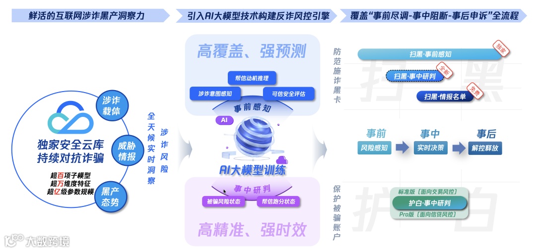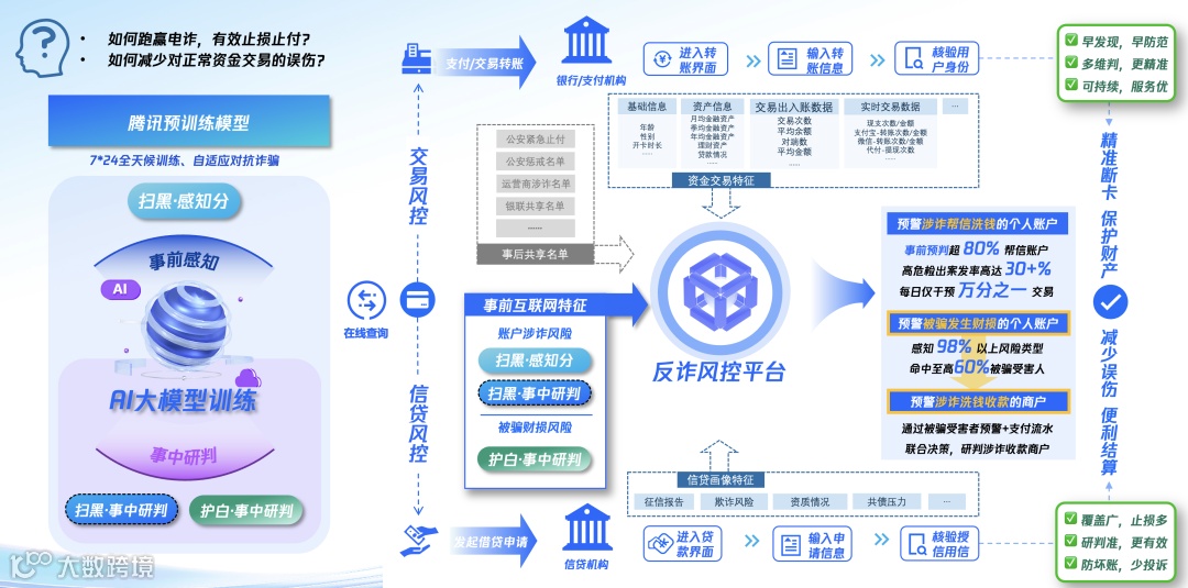 上述引入AI大模型技术预训练形成的反诈能力,可通过金融机构外数平台,嵌入自有的反诈风控平台(决策引擎),与已建立的事中规则、风控模型和运营体系相结合,为金融机构精准研判“资金链”,长效压降涉诈风险提供显著增益。