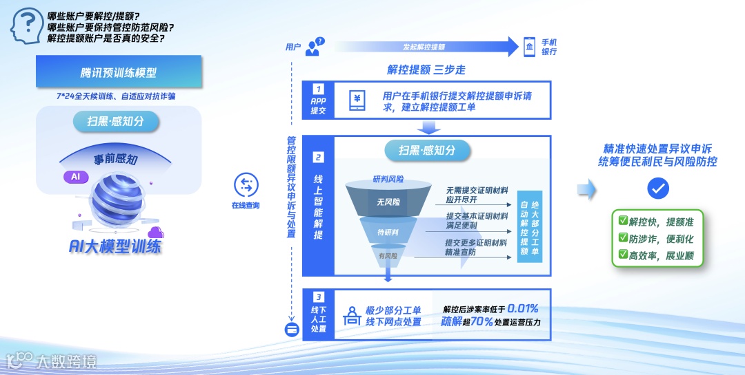 项目落地前,该行从业务一线抽调上百位骨干专家,专职处置异议申诉工单;项目落地后,大多数解控提额工单可由用户通过手机银行自助提交并自动化处置,无需线下网点排队办理。该行释放了超70%的骨干专家回归核心展业,同时经“无监督自主决策”“有监督联合决策”智能解提的账户,案发率低至万分之一,安全性与精准性优于骨干专家人工研判。