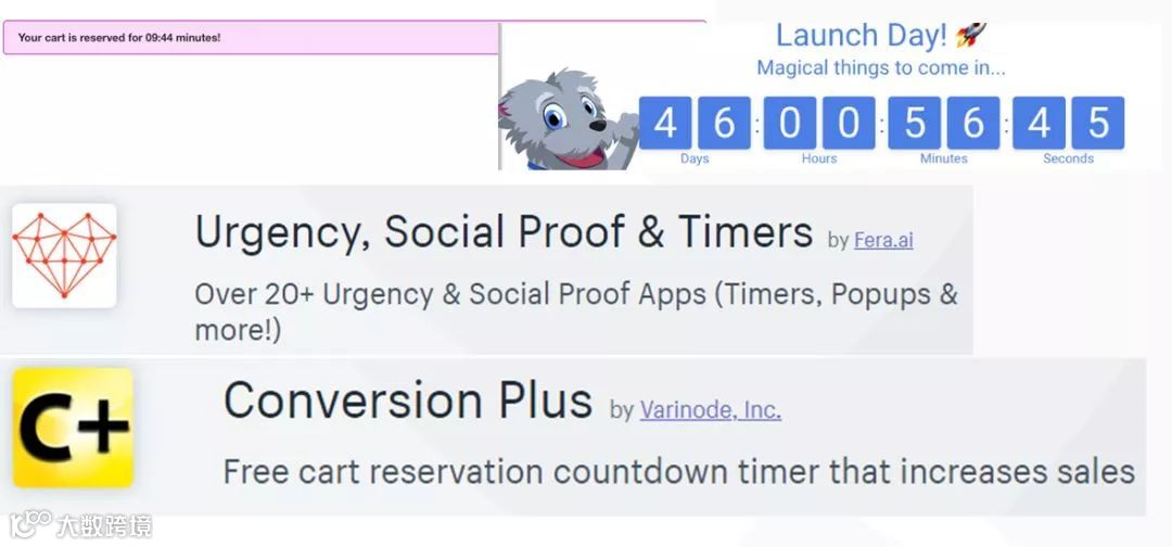 倒计时,倒计时分为主页活动倒计时、产品热够倒计时、购物车倒计时、结账倒计时四种,主要是增强用户的紧迫感,让用户更快下单。在这里分享两个倒计时的插件,Urgency和Conversion Pus。
