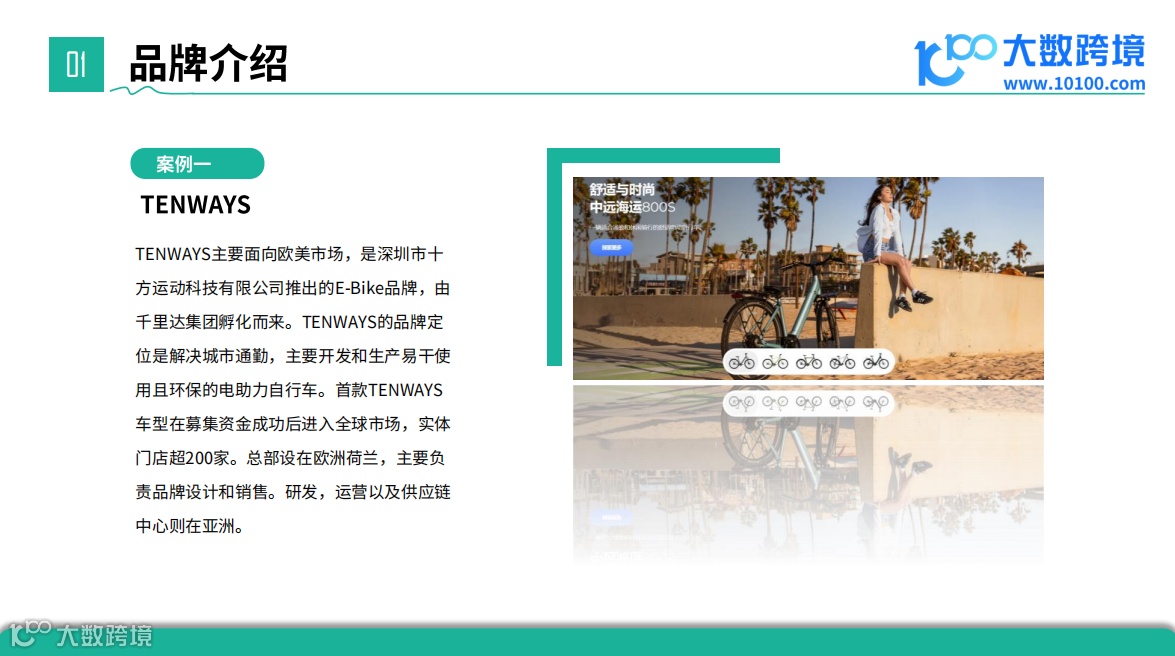 TENWAYS主要面向欧美市场,是深圳市十方运动科技有限公司推出的E-Bike品牌。该品牌通过募集资金进入全球市场,并在欧美地区建立了庞大的销售网络。TENWAYS的成功在于其对市场需求的精准把握和产品的高质量研发。此外,品牌还注重本土达人效应和社交媒体推广,提升了品牌的知名度和影响力。