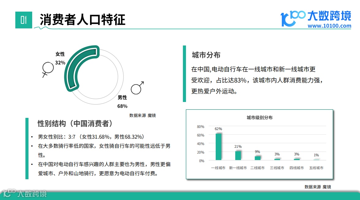 E-Bike的主要消费群体为中高收入家庭和青年群体。男性是主要的消费者,尤其是城市居民和户外运动爱好者。入门级电动自行车仍有较大的发展空间,下沉市场的潜力巨大。