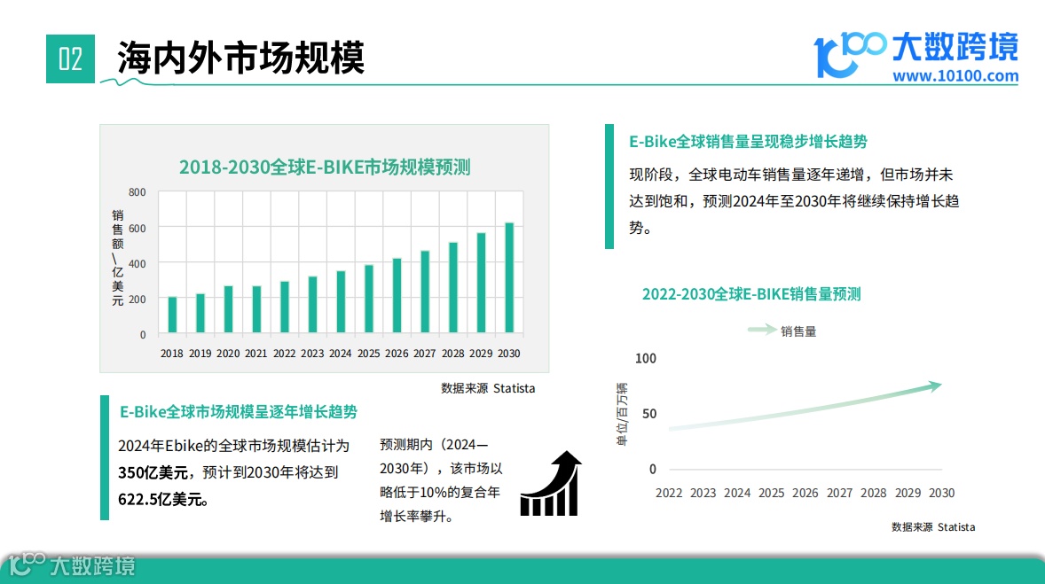 随着绿色出行理念的全球化,电动自行车(E-Bike)在国内外市场备受消费者青睐。根据《大数跨境:2024全球E-Bike市场洞察报告》,我们了解到,全球电动自行车市场正呈现出指数级增长的趋势。本报告基于详实的数据和信息,旨在深入分析E-Bike市场动态、消费者需求及行业发展前景,帮助企业预测市场变化、把握市场机遇、提升市场竞争力。