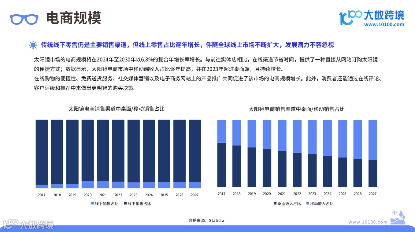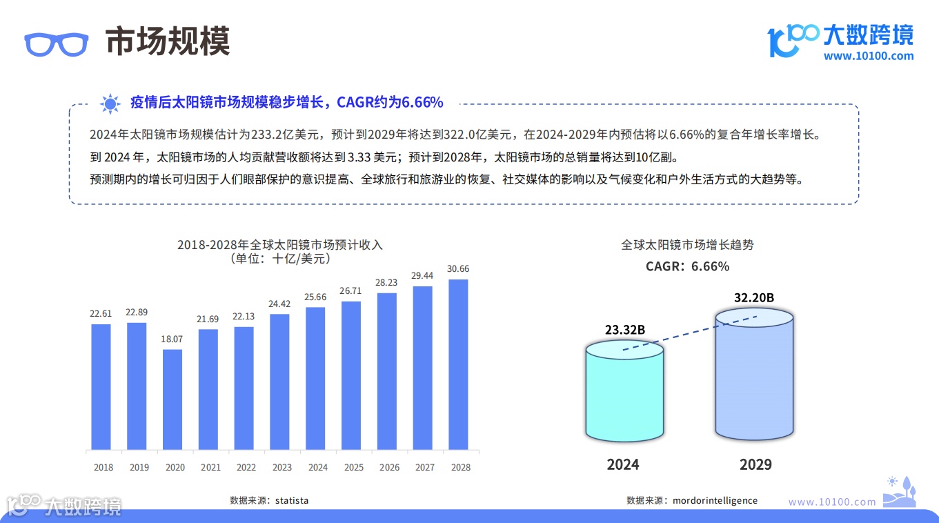 综上所述,《大数跨境:2024全球太阳镜市场洞察报告》全面剖析了市场趋势、行业概况及消费者需求,揭示了太阳镜行业的广阔前景。未来的太阳镜市场预计将继续保持增长态势,尤其是在新兴市场和年轻消费群体中。品牌需不断适应变化,通过独特的设计和技术创新来满足日益多样化的消费需求,以在竞争日益激烈的市场中保持领先地位。