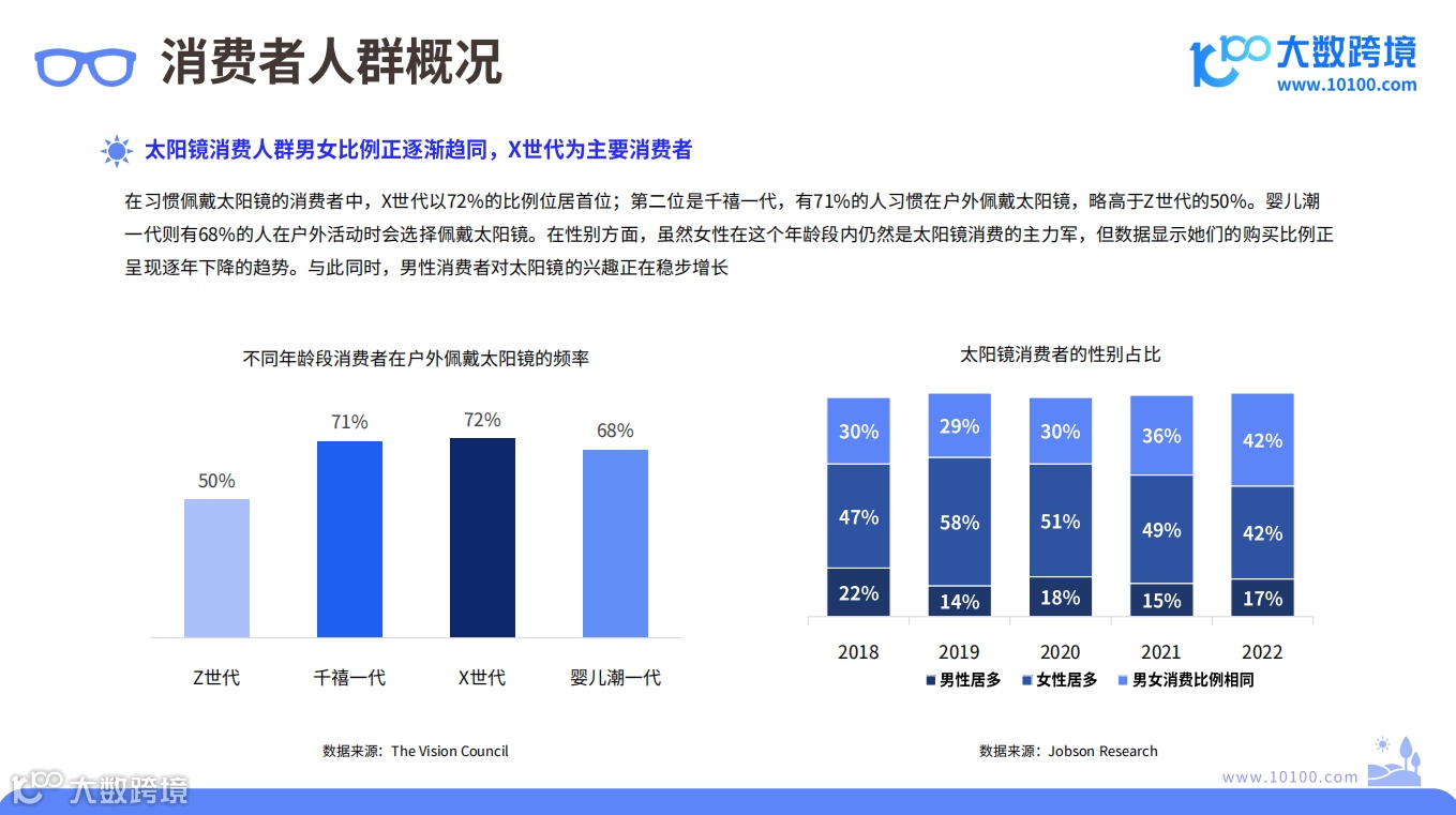 习惯佩戴太阳镜的消费者中,X世代以72%的比例位居首位;第二位是千禧一代,有71%的人习惯在户外佩戴太阳镜。虽然女性在这个年龄段内仍然是太阳镜消费的主力军,但数据显示她们的购买比例正呈现逐年下降的趋势。与此同时,男性消费者对太阳镜的兴趣正在稳步增长。调查发现,对太阳镜健康益处的认识增加了成年人佩戴太阳镜的可能性,并让父母表示他们会鼓励孩子也使用太阳镜。