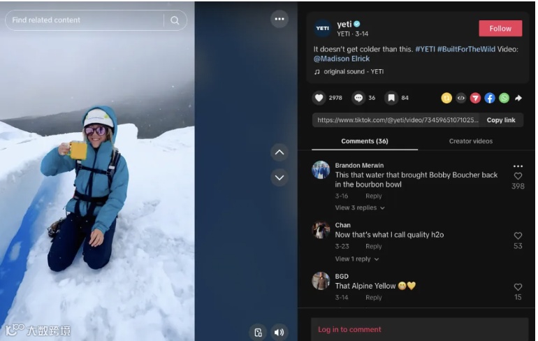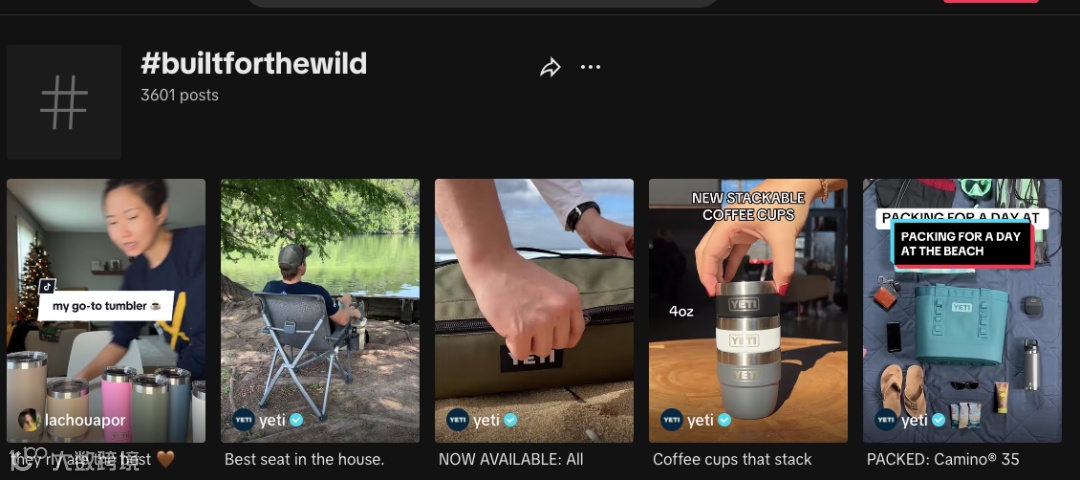 比如在TikTok上,YETI常常转发自家消费者在各自旅途中的视频,不仅展示了产品的特点和使用方式,更展现出独特有趣的户外生活,吸引了年轻用户的关注。
