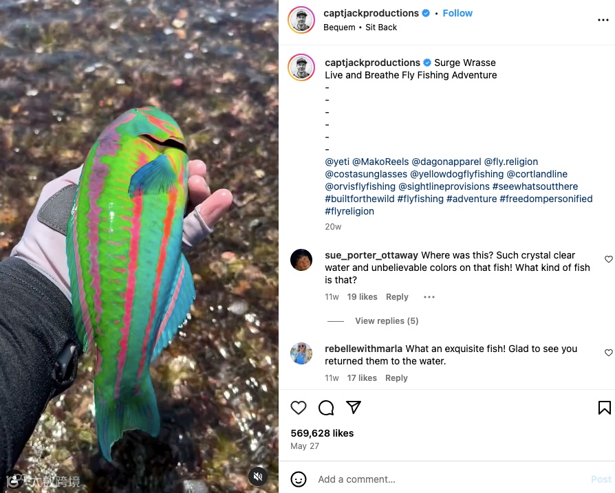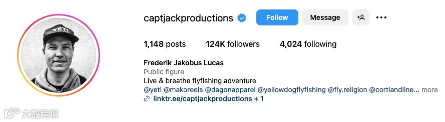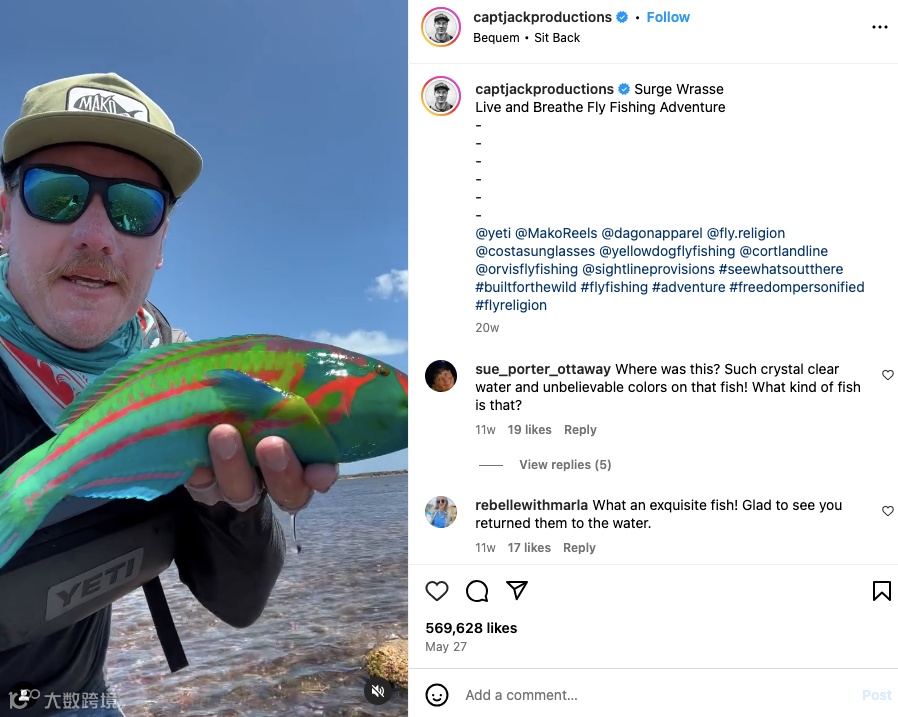 Frederik是一位著名的钓鱼专家,尤其擅长飞钓,经常钓上罕见的鱼类让钓鱼佬粉丝们称赞,他的垂直内容账号@captjackproductions目前有12.4万关注量,粉丝几乎都是发烧友,因此粘性很高。作为YETI的品牌大使,他在Instagram上分享了一系列与产品相关的内容。