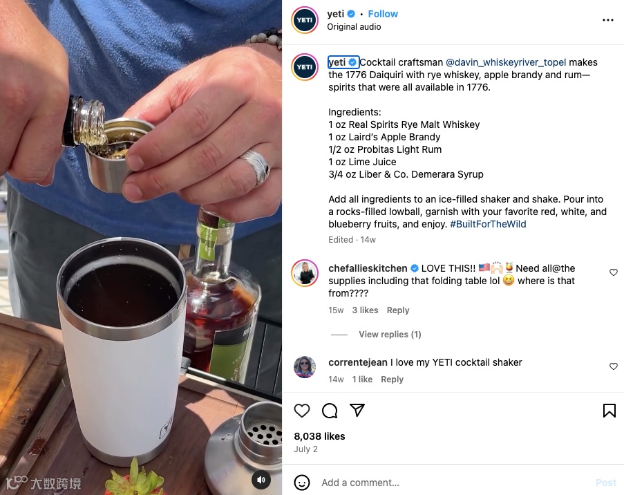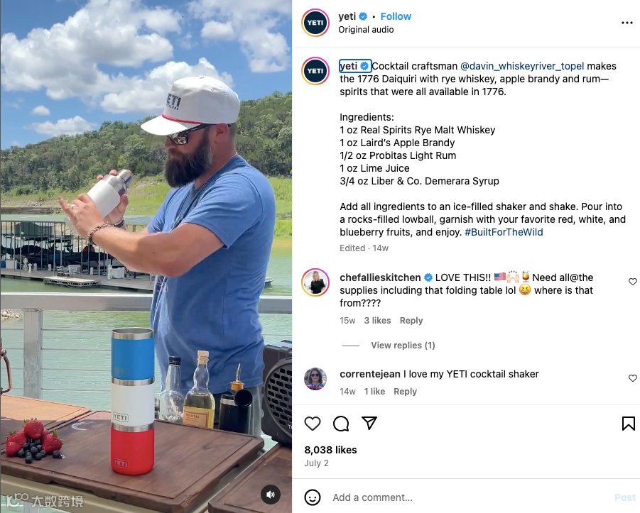 在他产品的推广视频中,他展示了使用YETI保温杯当作摇酒壶,在野外调出鸡尾酒的过程。Davin Topel直观展示了调酒的每一步,用户感受到YETI产品在户外环境中的多功能和便携性,让YETI的保温性能深入人心。同时在评论区放上了用到的原料,增加了内容可看性。这条视频在发布后迅速吸引了8k+的点赞,并收到了大量正面评价,许多用户在评论中询问购买链接、自己所在地区能不能买到。一条小小的视频,品牌投入在达人和内容制作的费用不多,但是却获得了直接的转化。