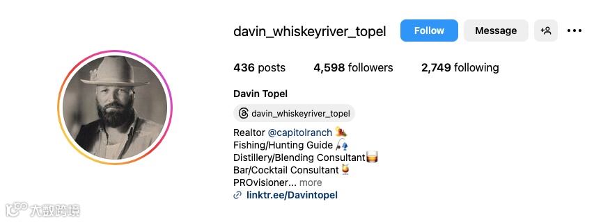 Davin Topel是一位热爱钓鱼和打猎的户外素人博主,同时他对调酒也颇有研究,他的粉丝不多,关注他的多数是户外发烧友,群体垂直。