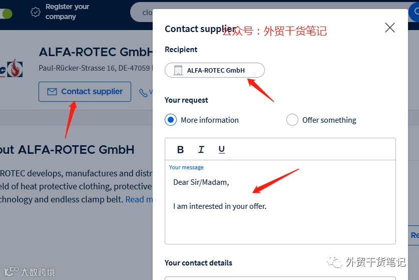 平台提供的公司详情信息包括:企业名称、地址、联系方式、官网链接、员工数量、企业简介等基础但核心的内容。此外,针对重点客户,用户还可通过平台直接在线发送开发信进行业务对接。