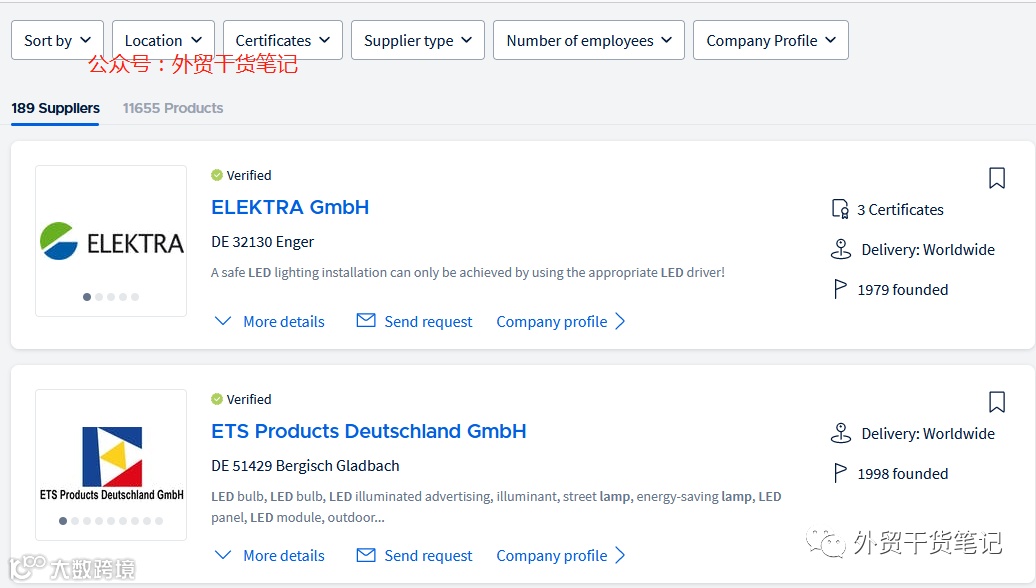 wlw.de支持免费检索功能,用户只需输入产品关键词即可快速筛选相关企业。例如输入“led lamp”,系统将显示对应的供应商列表,并可按公司类型、规模等条件进一步筛选。