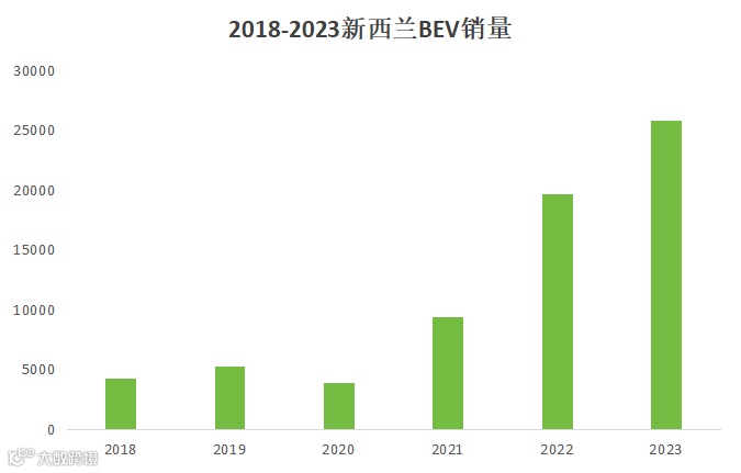2023年,新西兰新能源汽车销量达到30,628辆,同比增长30.2%。其中纯电动汽车销量为21,620辆,插电式混合动力汽车销量为9,008辆,对应的渗透率分别为19.6%和8.2%。