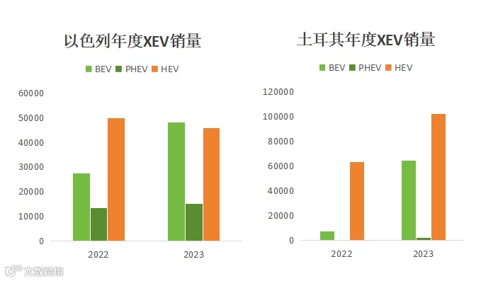 在中东地区,统计数据显示,2023年以色列和土耳其两国的新能源汽车销量达到了约13万辆,其中纯电动车型占比约11万辆,插电式混合动力车型约2万辆。