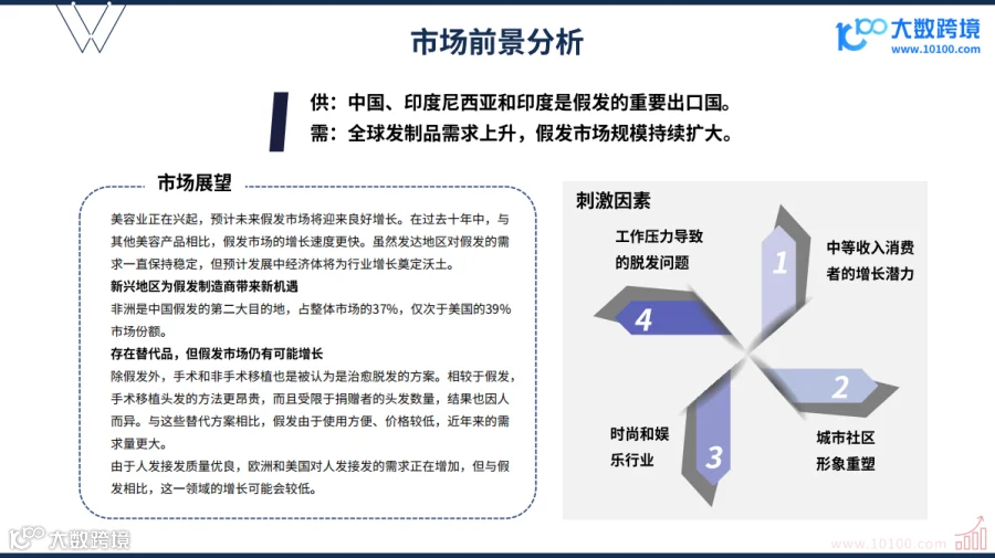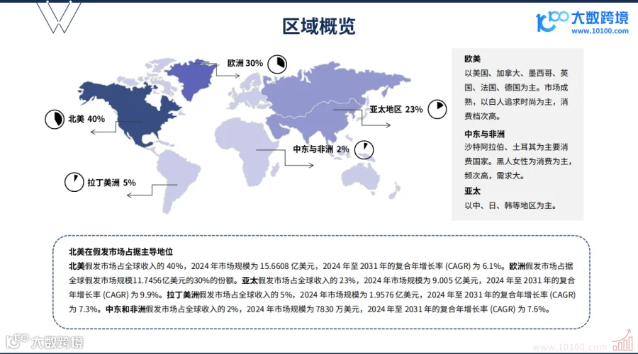 随着全球时尚潮流的不断演变和个性化需求的日益增长,假发市场正迎来前所未有的发展机遇。从传统的审美追求到现代的个性化表达,假发不再仅仅是掩盖头发问题的解决方案,它已经成为时尚、美容、影视、戏剧乃至医疗领域不可或缺的一部分。本报告深入探讨了2024年全球假发市场的现状及未来趋势,分析不同地区市场的需求、消费者偏好以及技术革新。我们不仅审视了假发作为功能性和美观性产品的双重价值,还特别关注了科技赋予假发选择的创新,以及该技术如何为市场带来新的活力和增长点。通过对行业趋势的科学预测和市场动态的深入分析,大数跨境旨在为读者揭示假发行业的未来发展方向,评估潜在的机遇与挑战。