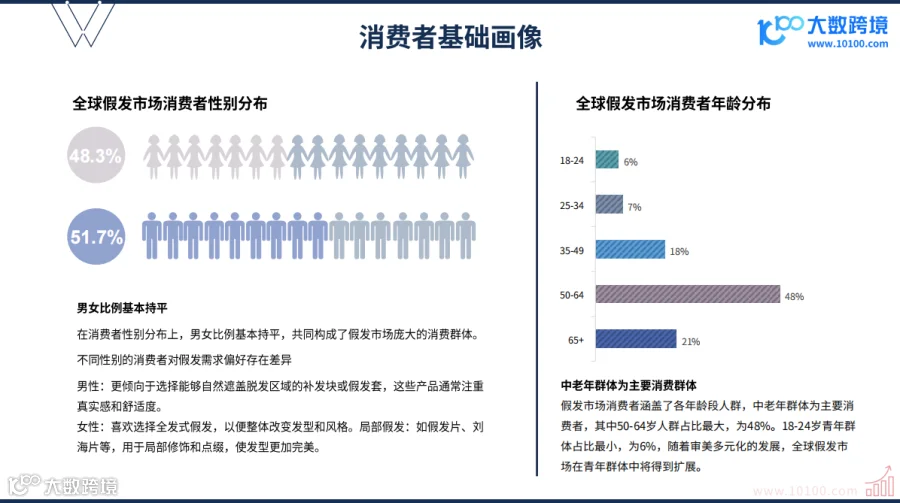 假发市场的消费者涵盖了各年龄段人群,其中50-64岁中老年群体为主要消费者,占比最大为48%。18-24岁青年群体占比最小,为6%,但随着审美多元化的发展,全球假发市场在青年群体中将得到扩展。在性别方面,女性是欧美地区假发的主要受众,尤其是18-45岁的女性为核心消费群体。在亚洲地区,真发假发为主要购买类型,主要用于隐藏脱发和日常美容及特别场合。