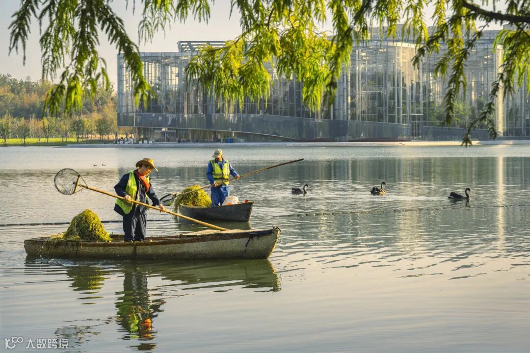 这幅作品将现代城市的生态之美与志愿守护的温度自然融合。暖调晨光裹着湖面的粼粼波光,前景垂落的枝叶将画面框成天然取景器,让清冽的湖水、悠然游弋的黑天鹅与背景的玻璃建筑形成层次分明的视觉对话。湖面作业者俯身打捞水草的身影,在静谧的水色里成了动态锚点,既勾勒出城市生态治理的鲜活细节,又让这份人与自然的共生图景,多了踏实的志愿温度。
