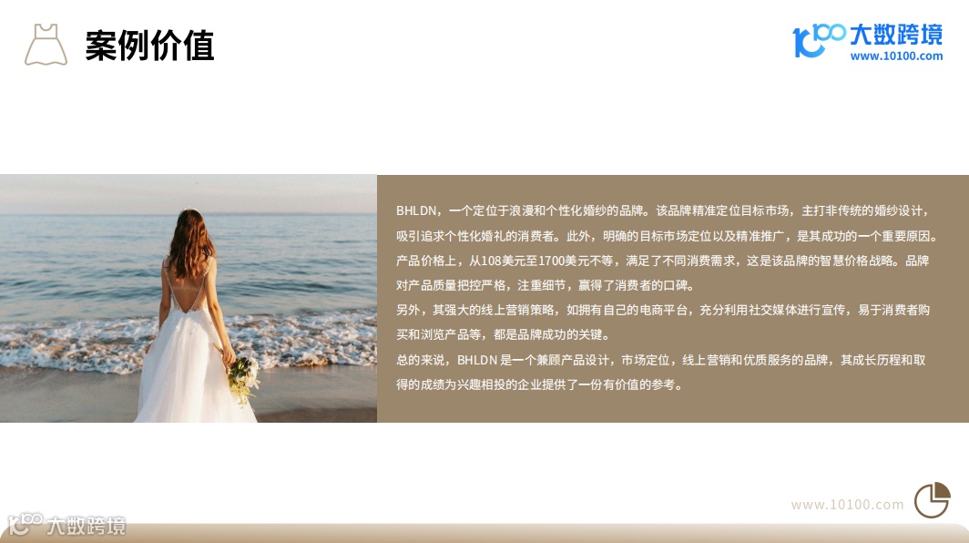 BHLDN是一家来自美国费城的知名婚纱品牌,其品牌名称来源于荷兰语,意为“保持”(to keep),象征着爱情的长久。BHLDN不仅提供各种婚纱礼服,还包括新娘发饰、婚礼用品等。Babyonline Dress精细地执行了跨国扩展策略,通过在线平台将商品销售给全球的消费者。这种充分利用网络商业可能性的方式对于公司的全球化发展有重要启示。其次,该品牌对于产品质量的关注赢得了大量忠实客户。高品质的设计和精湛的工艺让品牌在竞争激烈的市场中独树一帜。最后,其优秀的供应链管理和提供优质的客户服务也是一大亮点。既保证了产品及时送达消费者手中,同时在售后服务等方面下足了功夫。总的来说,研究Babyonline Dress品牌案例可以清楚地看到一个在线零售品牌如何通过充分利用电子商务、增加品牌价值和市场竞争力的过程。这对于那些正在寻找商业扩展和品牌建设策略的公司极具参考价值。