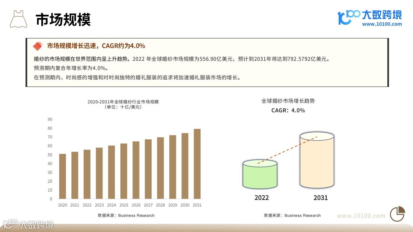 全球婚纱市场规模正在迅速扩大。2022年全球婚纱市场规模为556.90亿美元,预计到2031年将达到792.57亿美元。这一增长主要受到全球人口老龄化、脱发问题的增加以及人们对时尚和美容需求的不断提升的推动。中国是全球最大的婚纱生产国和出口国,年均出口量为36亿美元,占全球婚纱市场份额近70%-80%。
